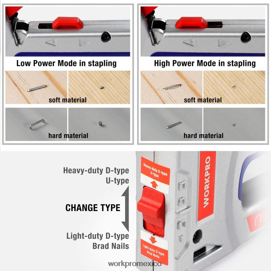 Práctica grapadora multifuncional capaz de sujetar grapas en D/grapas en U/grapas D ligeras/clavos. la palanca de ajuste de potencia alta/baja permite la fijación tanto en superficies duras como blandas.