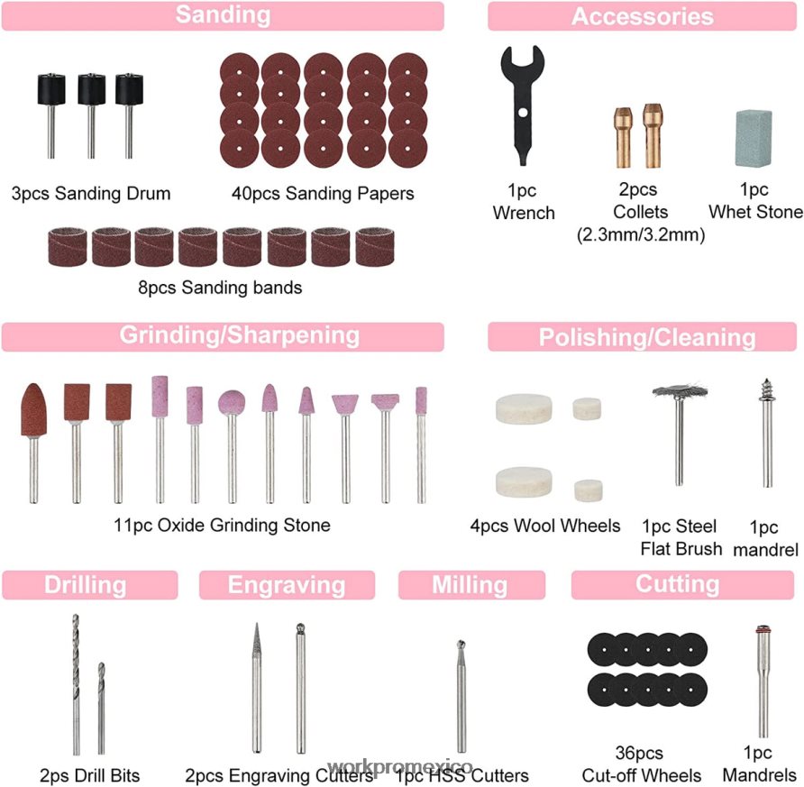 perfecto para tipos de materiales: el kit de herramientas rotativas inalámbricas incluye 114 accesorios en total con piedras de amolar y almohadillas de lijado , ruedas de fieltro, mandriles y mucho más. Viene con un portabrocas universal de tamaño de remolque (3/32" y 1/8"), que le permite cambiar rápida y fácilmente los accesorios de la herramienta rotativa libremente.